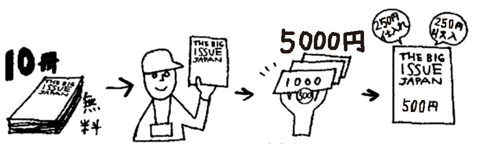 販売を希望するホームレスの方にまず最初は10冊の『ビッグイシュー日本版(定価500円)』を無料で提供します。その10冊の売上(500円×10冊=5,000円)を元手に、以降は1冊250円で仕入れていただき、路上で販売することで500円のうち250円が販売者の収入になります。販売と仕入れを繰り返すことでお金を増やし、ホームレスの方の自立を支援するという仕組みになっています。
